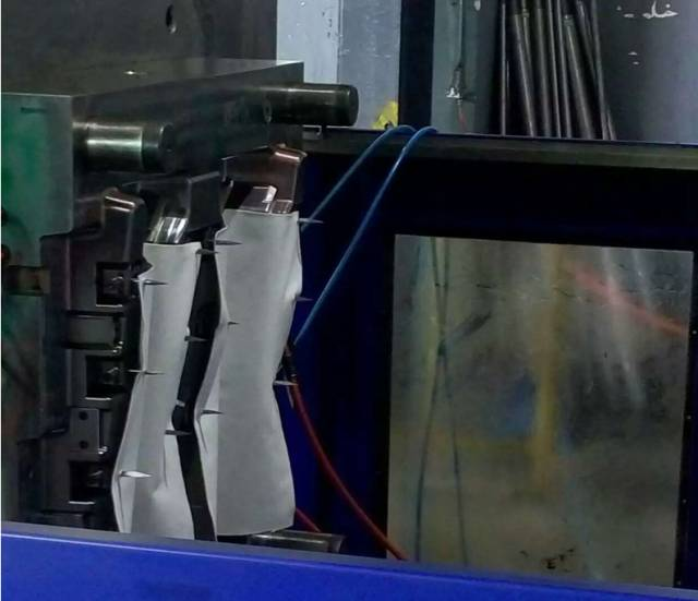 低壓注塑模具主要原(yuán)理是注塑壓力較低在布上流動,開模時要先把布掛到前模掛針上,合模(mó)、注塑、然後取件。