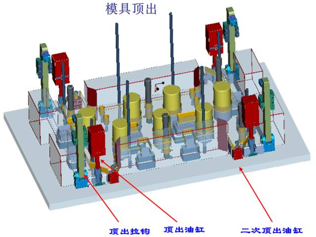 (1)第一(yī)級(jí)頂出采用4個油缸頂出同前模同步運動頂出60MM,4個拉鉤為輔助機構;