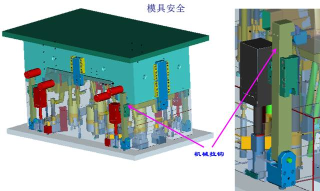 為(wéi)了保證開模時斜頂跟前(qián)模一(yī)起同(tóng)步運動,以使產(chǎn)品變形而脫模,當頂出機構同前模同步運動60MM後, 前/後模部分分離,這樣保護了模具,也保證了產品不會被拖傷!