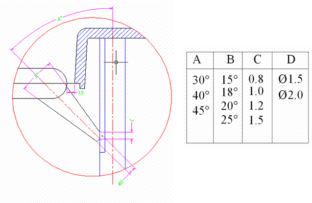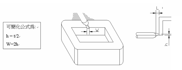 適用於大部塑料、各種側邊(biān)允許(xǔ)澆口痕跡的製品,開在製品的邊緣或邊緣頂麵,又分(fèn)標準入水、搭接入水和扇形入水(shuǐ),下圖中t為產品壁厚,L一般為(wéi)(0.8—1mm)